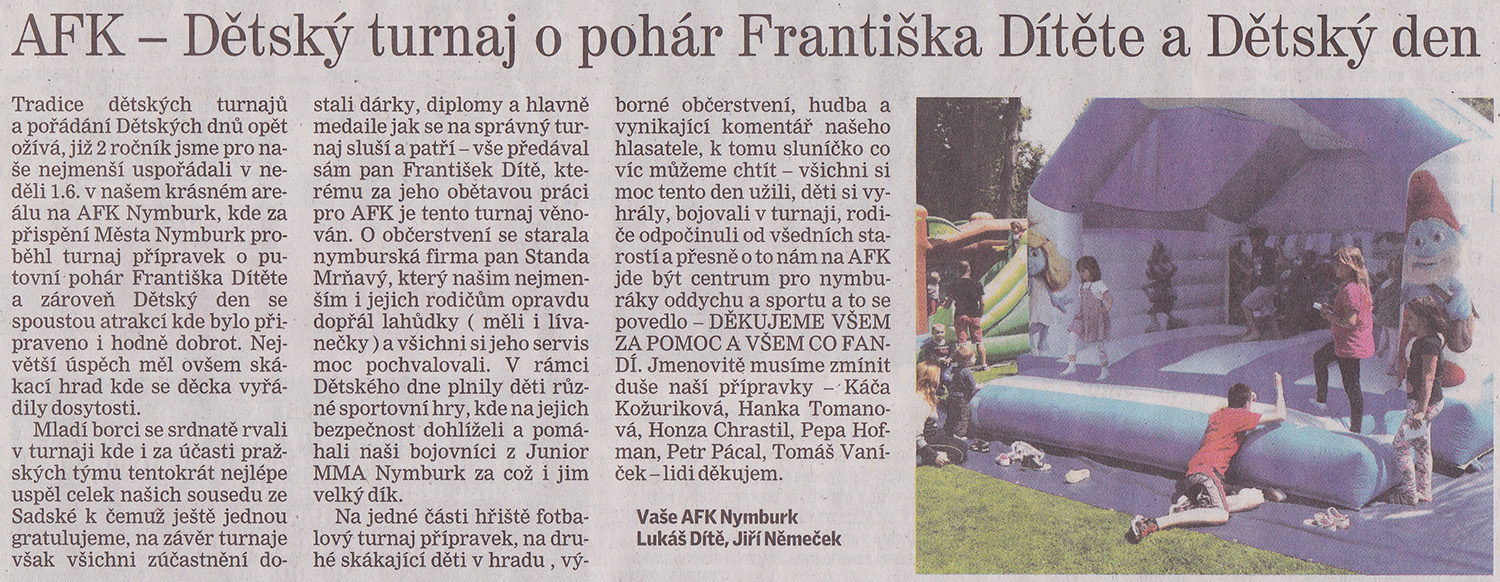 Dne 1.6. se konal již druhý ročník Dětského dne na AFK Nymburk. Za přispění Města Nymburk také proběhl turnaj přípravek o putovní pohár Františka Dítěte. :) Více v odkaze. |