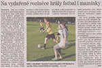První neúspěch. Dnešní zápas s týmem SK Kovanice, na který přivezl náš skvělý trenér J.Chrastil svůj tým, byl boj dvou silných a vyrovnaných mužstev. Po vcelku vlažném začátku se našim hráčům podařilo vstřelit vedoucí branku, ale soupeř nezaváhal. Srovnal skóre a navíc přidal další dva góly. Naši borci však nesložili zbraně a v rychlém sledu vyrovnali a v závěru poločasu přidali vedoucí gól (4:3). Více v odkaze. |