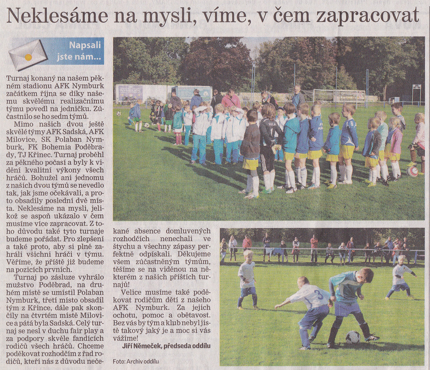 Dnešní zápas v Poděbradech se našim borcům povedl, vyhráli jsme 16 : 0! Družstvo Poděbrad bylo naším dobrým a šikovným soupeřem. Naši hráči se snažili držet pokynů svého SUPER trenéra Honzy a nejen bezhlavě střílet na bránu, ale přihrávat si a po té zakončovat střelou do brány. Tak jak to má být. Byl to fotbal na který se dobře koukalo a rodiče našich malých borců byli dobrými fanoušky. Počasí nám také přálo, bylo krásné slunečné odpoledne. Naše Jitka s Katkou měly opět vše pod kontrolou. :) Foto v odkaze. |