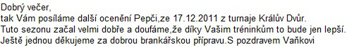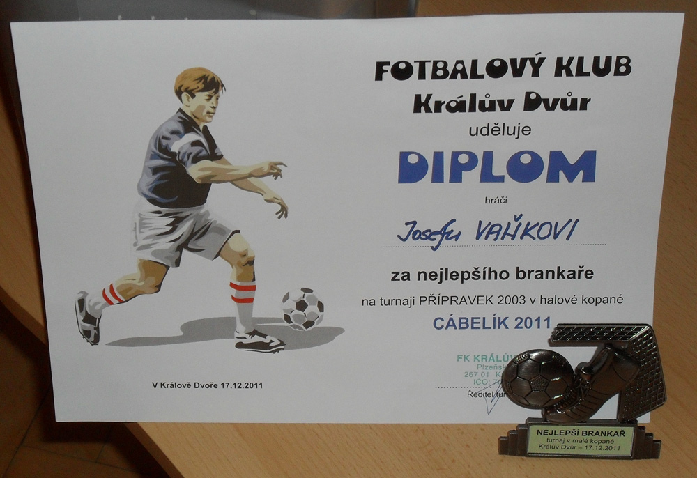Náš svěřenec, Josef Vaněk, získal opět další ocenění za nejlepšího brankáře turnaje! A to dne 17.12.2011 z turnaje Králův Dvůr.