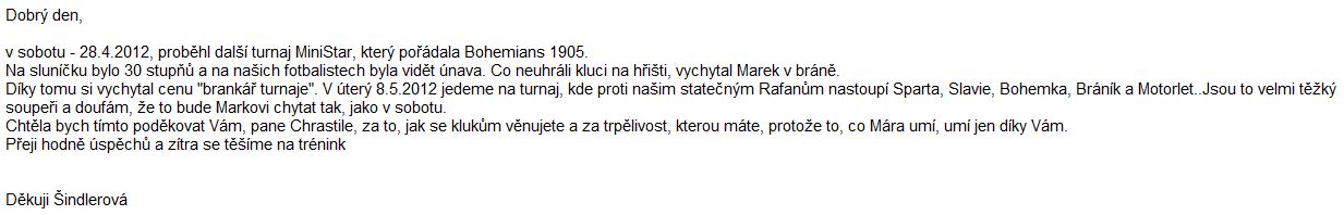 V sobotu - 28.4.2012, proběhl turnaj MiniStar, který pořádala Bohemians 1905 a náš svěřenec, Marek Šindler, získal ocenění pro nejlepšího brankáře turnaje!