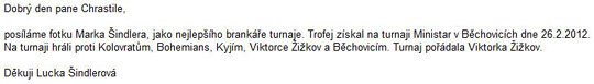 Našim svěřencům se nadále daří! Marek Šindler z SK Úvaly získal ocenění pro nejlepšího brankáře turnaje Ministar v Běchovicích dne 26.2.2012. Turnaj pořádala Viktorka Žižkov a zúčastnily se ho například týmy Kolovraty, Bohemians, Kyje, Viktorka Žižkov nebo Běchovice.