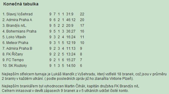 MARTIN ČIHÁK za tým Brandýs n/L. nejlepším brankářem VIII. ročníku zimního turnaje starších žáků „Memoriál Oldřicha Valchaře a Jana Roubíka„, který pořádal klub FK Admira Praha. Celkem inkasoval v devíti zápasech 9 branek a v 5 utkáních udržel čisté konto.