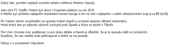 Náš další svěřenec, Martin Vejvoda, získal významné ocenění! Jeho týn FC Graffin Vlašim byl druhý v Krajském přeboru za rok 2010 a Martin Martin byl vyhlášen nejlepším brankářem tohoto turnaje a tím se stal i nejlepším v celém středočeském kraji (cca 80 týmů)! Martin dále předvedl skvělý výkon i v dalších zápasech.