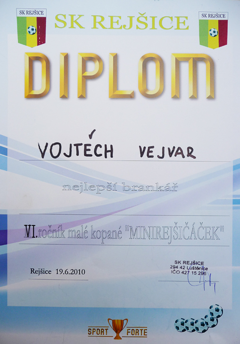 Další náš svěřenec, Vojtěch Vejvar, získal ocenění pro nejlepšího brankáře v VI. ročníku malé kopané "Minirejšičáček" v SK Rejšice dne 19.6.2010. Blahopřejeme mu a věříme, že oceněných svěřenců Brankářské školy Jana Chrastila bude daleko více a velice jim to přejeme! |