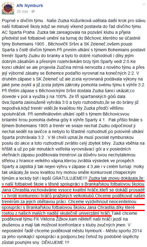 Jsme rádi, že se Zuzce opět a stále daří a že z jejího výkonu je nadšený i její mateřský klub AFK Nymburk.