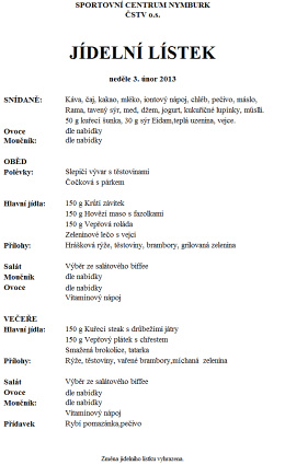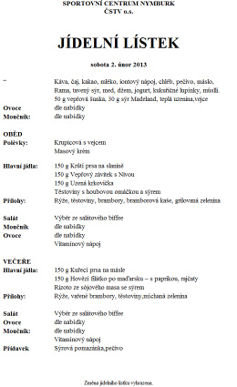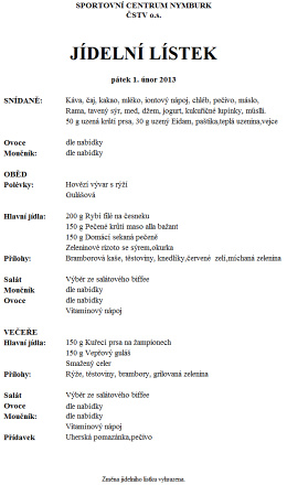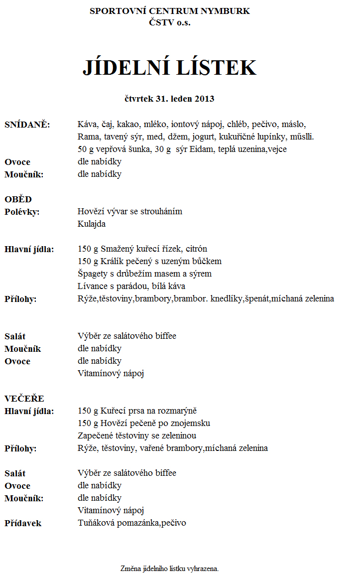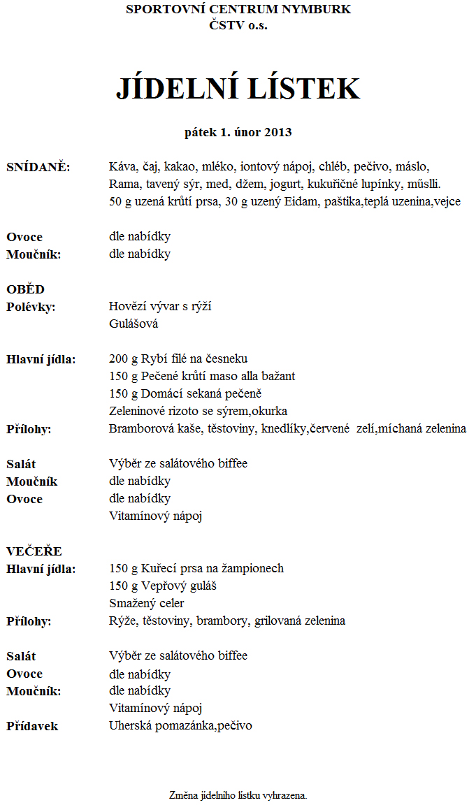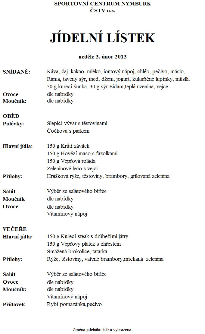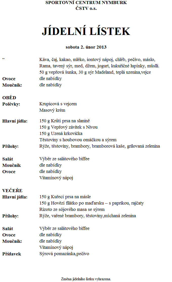 Čtvrté zimní soustředění BFŠ Jana Chrastila 2013 v SC Nymburk se již blíží. Ani ne za týden budete v plném zápřahu. Kromě krásného prostřední SC Nymburk, příjemného kolektivu a trenérů, bazénu, výřivky a samozřejmě i tréninkových hřišť, technogymu a dalších věcí, se účastníci mohou těšit také na standartně kvalitní jídlo.